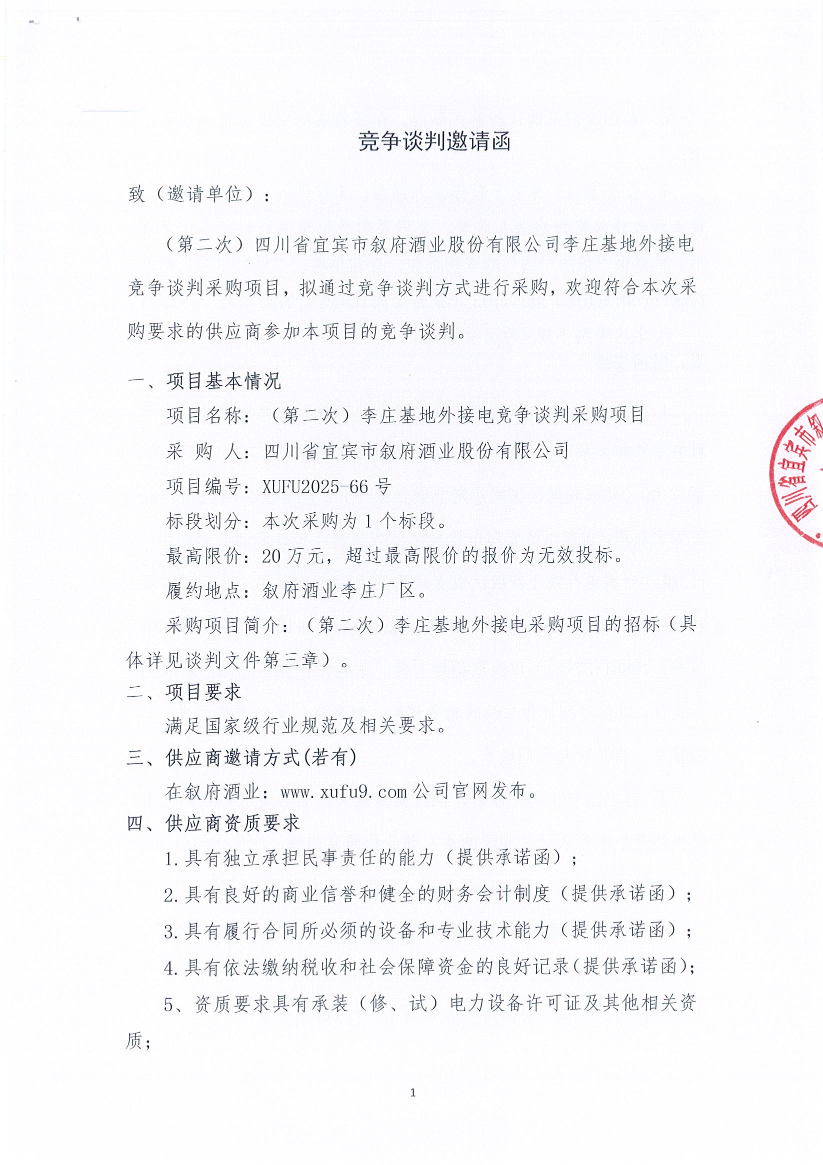 (第二次)四川省宜宾市叙府酒业股份有限公司李庄基地外接电竞争谈判采购项目比选招标公告