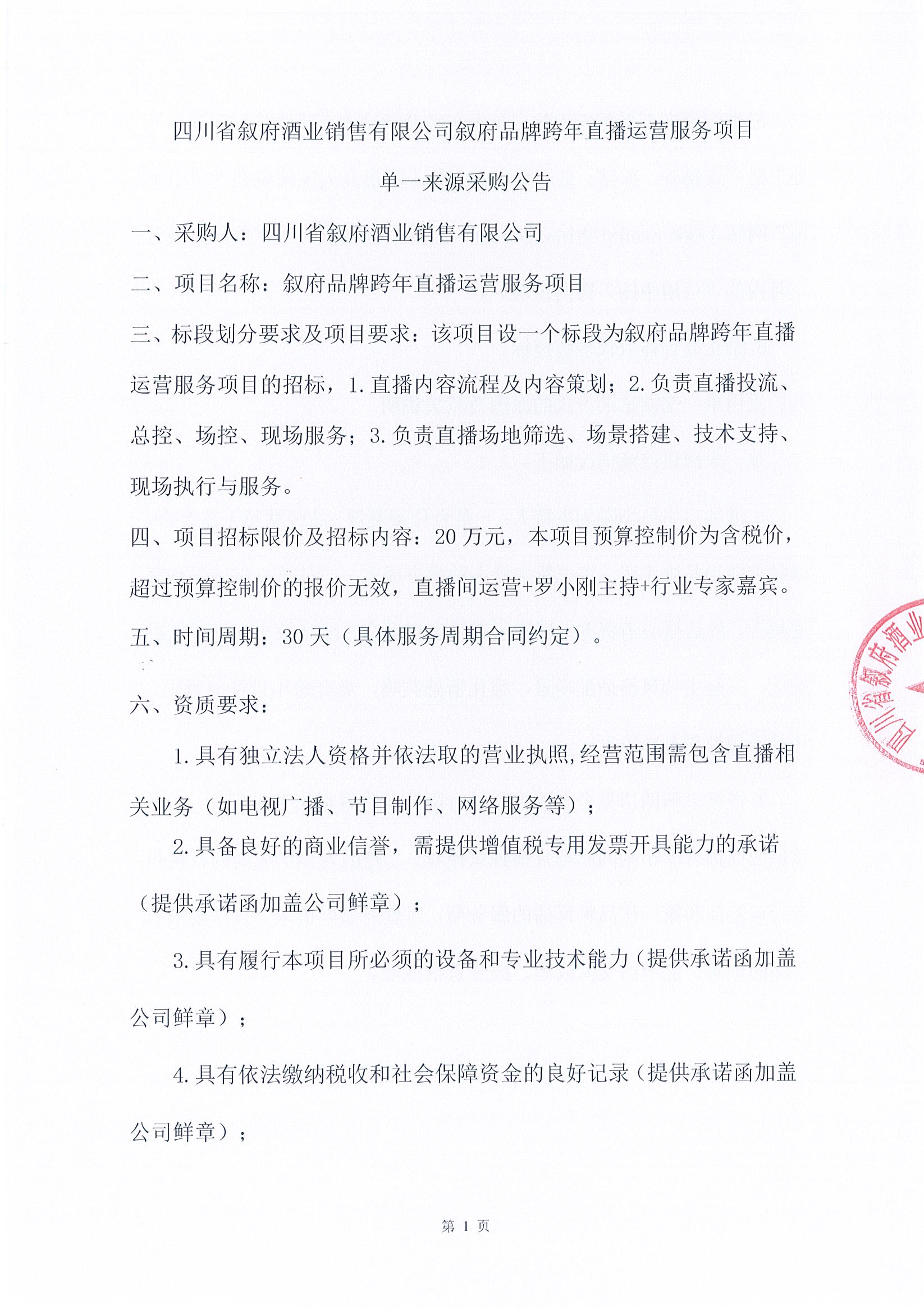 四川省叙府酒业销售有限公司叙府品牌跨年直播运营服务项目单一来源招标公告