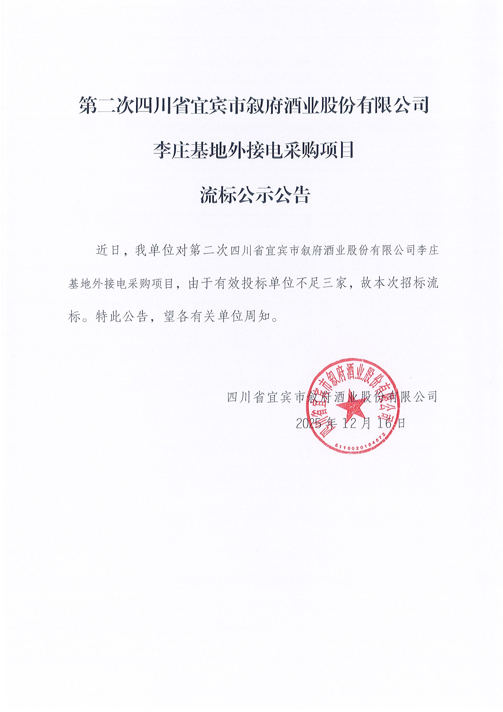 第二次四川省宜宾市叙府酒业股份有限公司李庄基地外接电采购项目流标公示公告