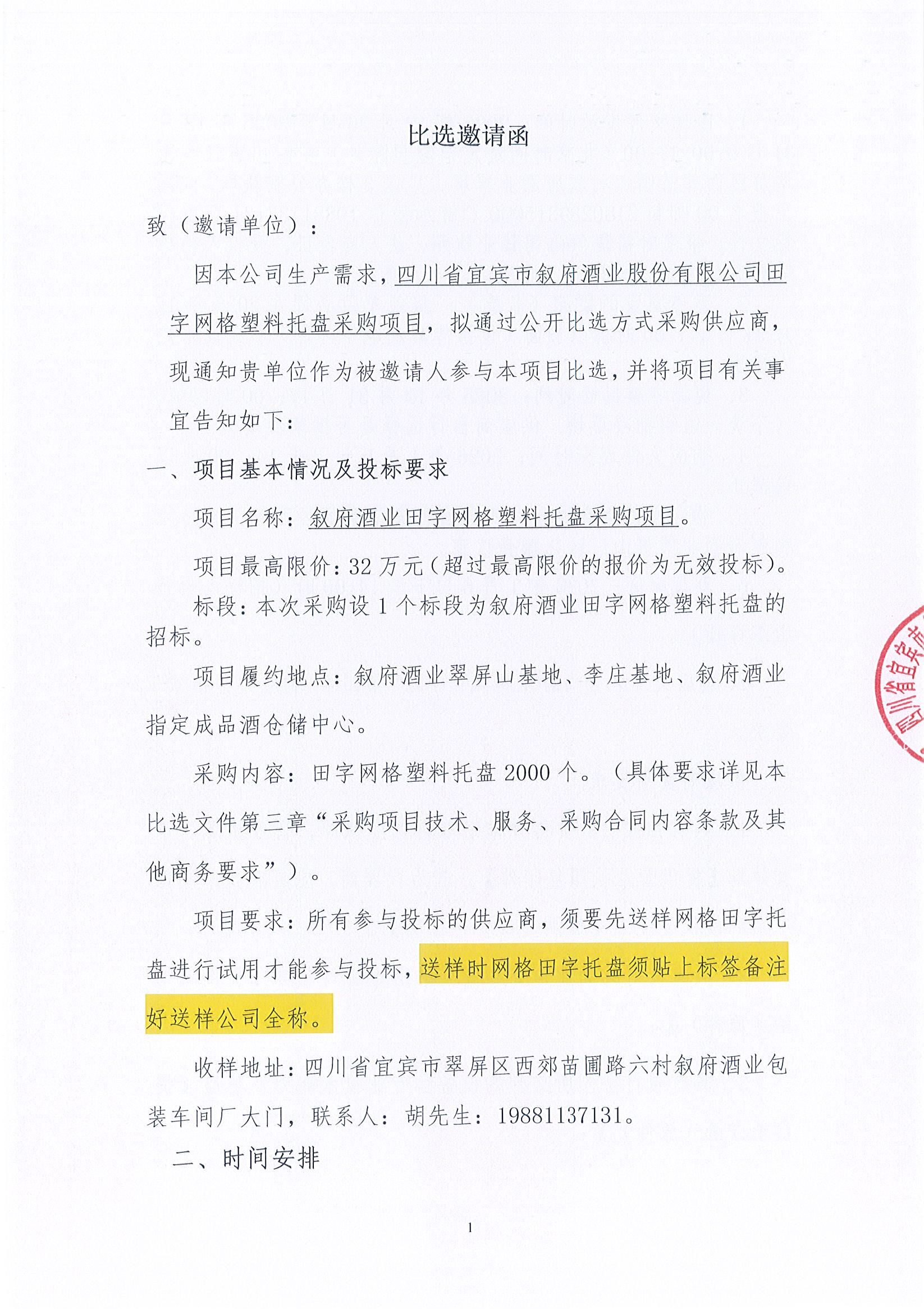 四川省宜宾市叙府酒业股份有限公司田字网格塑料托盘采购项目比选招标公告