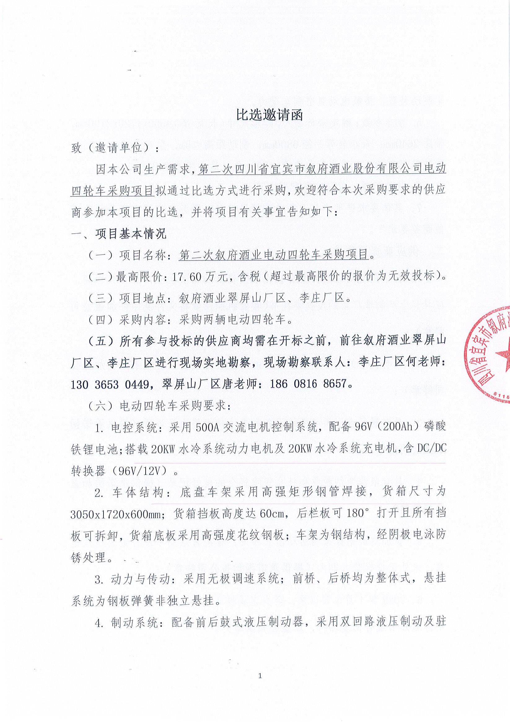 四川省宜宾市叙府酒业股份有限公司电动四轮车采购项目比选招标公告