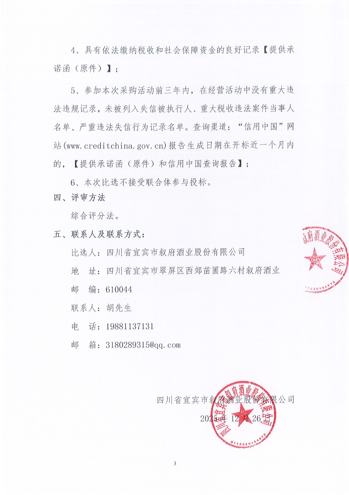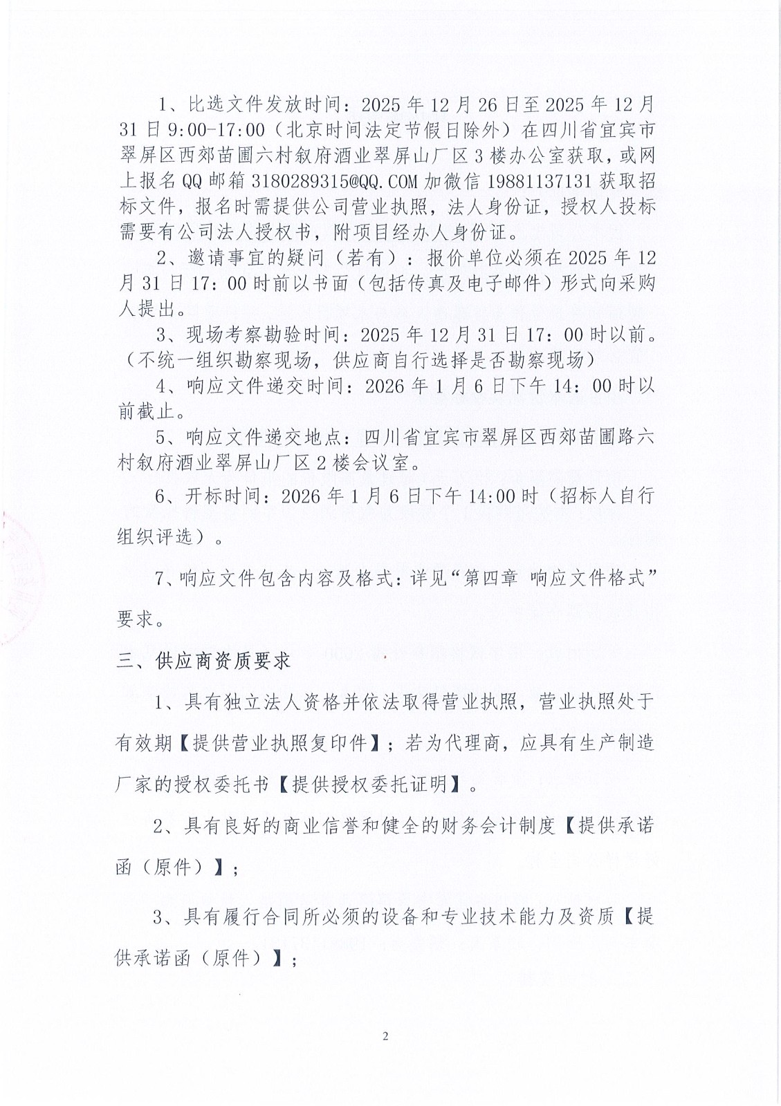 四川省宜宾市叙府酒业股份有限公司电动四轮车采购项目比选招标公告